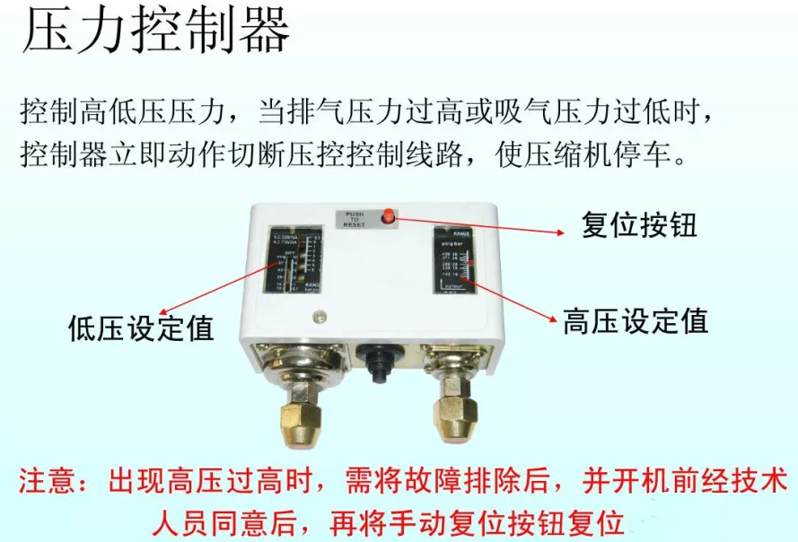 機(jī)械式壓力控制器屬于制冷機(jī)組壓力的控制的元器件,在制冷系統(tǒng)中主要用作高壓/低壓/高低壓壓力控制器。使用方法簡(jiǎn)單,在壓力控制器上面設(shè)定一個(gè)壓力,以高于或者低于此壓力的壓力控制器觸點(diǎn)動(dòng)作,然后可以發(fā)出信號(hào)以保護(hù)制冷壓縮機(jī)為主。