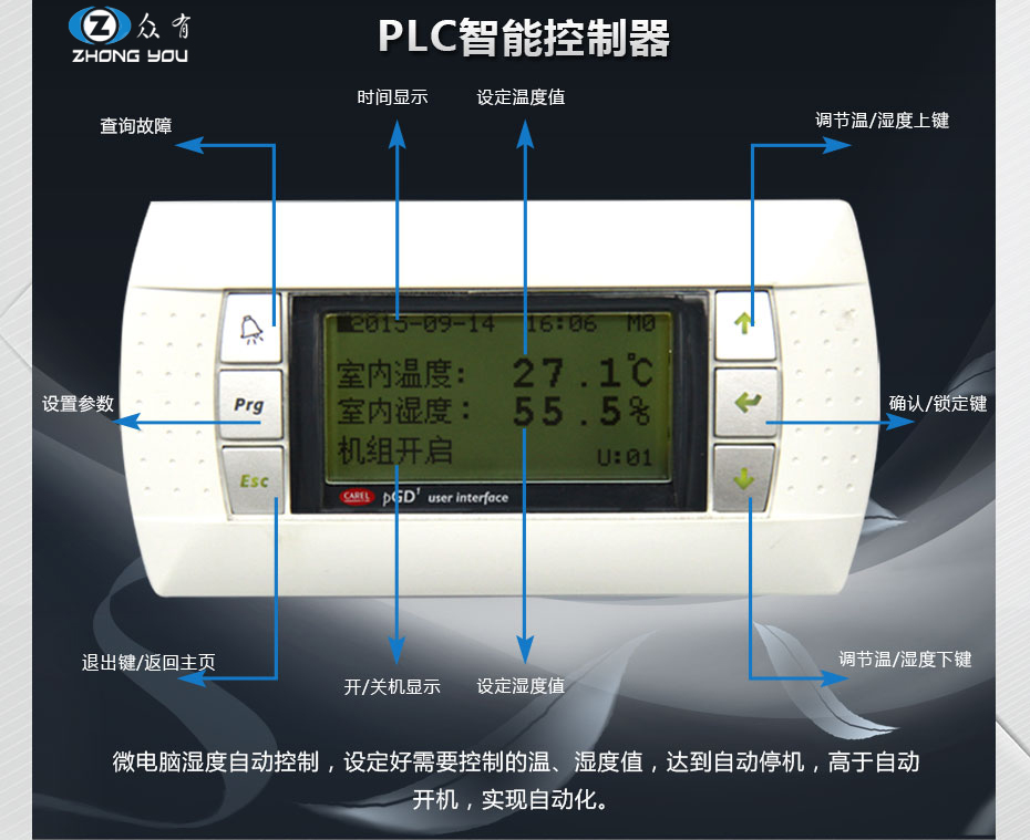 機(jī)組采用了專用的微電腦控制,可根據(jù)用戶設(shè)定的相對濕度自動(dòng)啟停、精度高、可靠性好、外形美觀、操作簡便。
