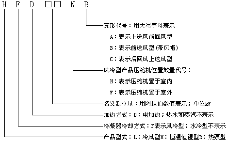 型號舉例:HF19N 表示名義制冷量為19kW的壓縮機置于室內的風冷型單元式空調機組。